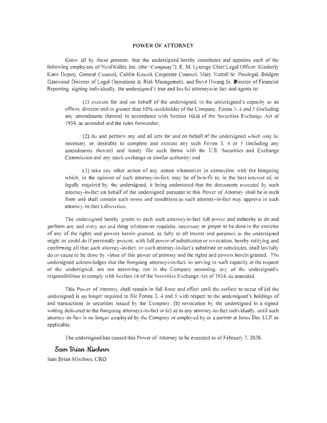 POWER OF ATTORNEY Know all by Lhese presents. that the undersigne.d hereby constitutes and appoints each of the following employees of Nerd Wallet, Inc. (the '·Comp/111)'"}: E. M. Lysonge Chief Legal Ofliccr. Kimberly Kane Deputy General Counsel, Caitlin Koseck Corporate Counsel. Mary Nuttall Sr . Paralegal, Bridgett Gatewood Director of Legal Operations & Risk Management. and Steve Hwang Sr. Director offinancial Repo11ing, signing individually, the undersigned's true and lawful attorneys-in fact and agcms 10: (I} exccrne for and on behalf of the undersigned, in the undersigned's capacity as an officer, director and/or greater than JO% swckholder of the Company. Forms 3. 4 and 5 (including any amendments thereto) in accordance with Section 16(a) of the Securities Exchange Act of 1934. as amended and the rules thereunder; (2) do and perform any and all acts for and on behalf of the undersigned which may be necessary or desirable to complete and execme any such Fonns 3. 4 or 5 (including any amendments thereto) and timely tile such forms with the U.S. Securities and Exchange Commission and any stock exchange or similar authority; and (3) take any other action of any nature whatsoever in connection with lhe foregoing which, in the opinion of such anorney•in•fact. may be of bendil to. in the best interest of. or legally required by. the undersigned, it being understood that the documents executed by such attorney-in-fact on behalf of the undersigned pursuant to this Power of Attorney shall be in such form and shall contain such tenns and conditions as such anorney-in-fact may approve in such attornc.y-in-fac,·s discrcLion. The undersigned hereby grants 10 each such attomey-in-fact full power and authority to do and perform any and every act and thing whatsoever requisite� necessary or proper to be done in lhe exercise of any of the rights and powers herein gmnted. as fully to all intents and purposes as the undersigned might or could do if personally present. with full power of substitution or revocation, hereby ratifying and confiiming all that such attorney-in-fact_ or such attorney-in-fact's substinne or substitutes. shall lawfully do or cause to be done by vim1e of this power of attorney and the rights and powers herein granted. The. undersigned acknowledges that the. foregoing attorneys-in-fact� in serving in such capacity at the request of the undersigned. are not assuming. nor is the Company assuming. any of the undersigned's responsibilities to comply with Section 16 of1he Securities Exchange Act of 1934, as amended. This Power of Attorne)' shall remain in full force and effoc., until the earliest to occur of (a) ihc undersigned is no longer required to file Forms 3. 4 and 5 with respect to the undersigned's holdings of and transactions in securities issued by the Company. (b) revocation by the undersigned in a signed writing delivered to the foregoing anorneys-in-fact or (c) as to any attorney-in-fact individually, until such attorn�y-in-fact is no longer emplo)red by the Company or employed by or a partner at Jones Day LLP� as applicable. y 7. 2026.The undersigned bas caused this Power of Anorney to be execuccd as of Februar Sam, 13ua11, � Sam Brian M ischner, CRO