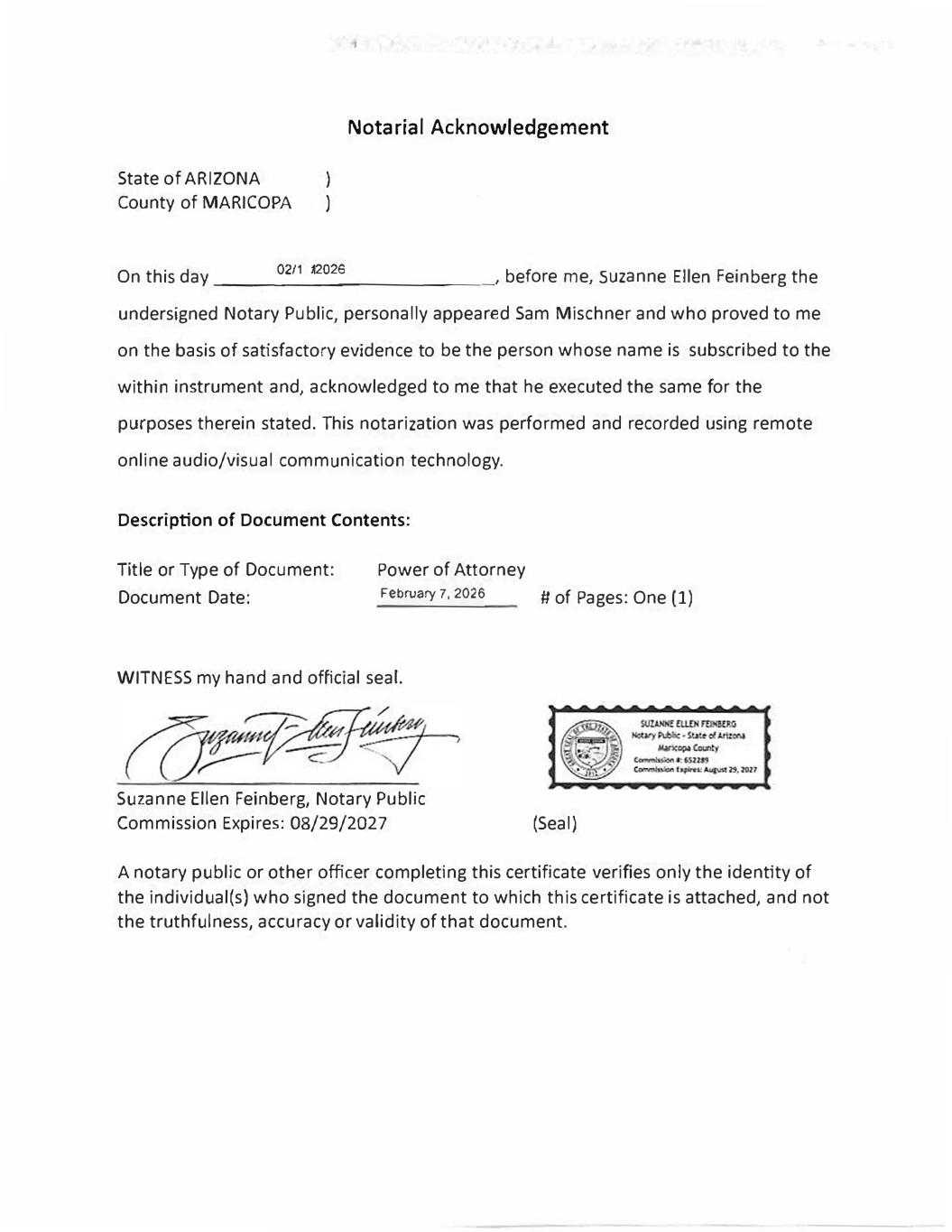 Notarial Acknowledgement State of ARIZONA ) County of MARICOPA ) On this day ____ 02_1_1 _12_0_26 ______ ___, before me, Suzanne Ellen Feinberg the undersigned Notary Public, personally appeared Sam Mischner and who proved to me on the basis of satisfactory evidence to be the person whose name is subscribed to the within instrument and, acknowledged to me that he executed the same for the purposes therein stated. This notarization was performed and recorded using remote online audio/visual communication technology. Description of Document Contents: Title or Type of Document: Document Date: Power of Attorney February 7, 2026 WITNESS my hand and official seal. Suzanne Ellen Feinberg, Notary Public Commission Expires: 08/29/2027 # of Pages: One (1) (Seal} A notary public or other officer completing this certificate verifies only the identity of the individual(s) who signed the document to which this certificate is attached, and not the truthfulness, accuracy or validity of that document.